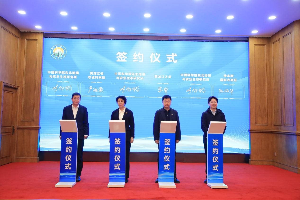 东北地理所与海伦市、北安市、密山市人民政府分别签署了科技创新合作协议,进一步深化地方科技合作。东北地理所与黑龙江省农业科学研究院、黑龙江大学、佳木斯国家农高区、北大荒农垦集团等机构达成合作协议,携手推进黑土地保护技术的研发与推广。在成果转化方面,东北地理所与富尔集团-富尔五大连池市农业科技有限公司签署大豆品种转让协议,双方以2000万元的价格将大豆新品种“东生22”的生产经营权进行转让,创下了第三积温带大豆品种转化费用最高记录。黑龙江八一农垦大学与互沐思生物工程有限公司签约。