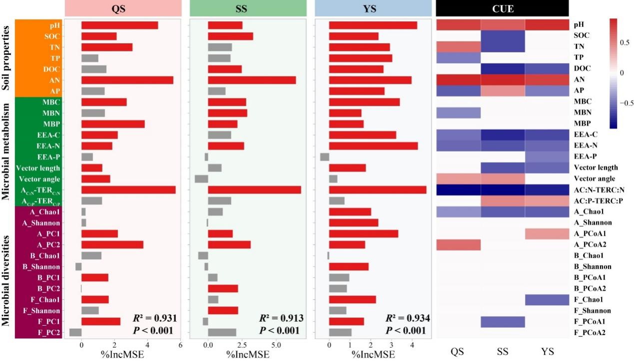 有机栽培提高了土壤pH值和速效养分含量,缓解了微生物碳和氮限制,从而增强了微生物化学计量平衡和碳利用效率。常规栽培下,在水稻生长的后期微生物为应对养分胁迫,分配更多能量用于合成胞外酶,导致微生物多样性和生物量下降,最终降低了微生物CUE(图1)。土壤有效氮含量和碳氮阈值元素比(TERC:N)是微生物CUE的关键调控因子(图2)。研究发现地杆菌科(Geobacteraceae)相关属、Ferruginibacter和Propioniciclava等通过调节微生物的生长策略和代谢途径对CUE产生显著影响。具有高rRNA操纵子(rrn)拷贝数的微生物模块更倾向于采用快速生长策略(Y策略),促进碳向生物量合成方向分配,从而提升CUE(图1)。本研究强调了有机农业在提高土壤微生物碳利用效率以减少生态系统碳损失方面的潜力,为优化土地管理策略以实现土壤碳封存和推进可持续农业实践提供理论基础。