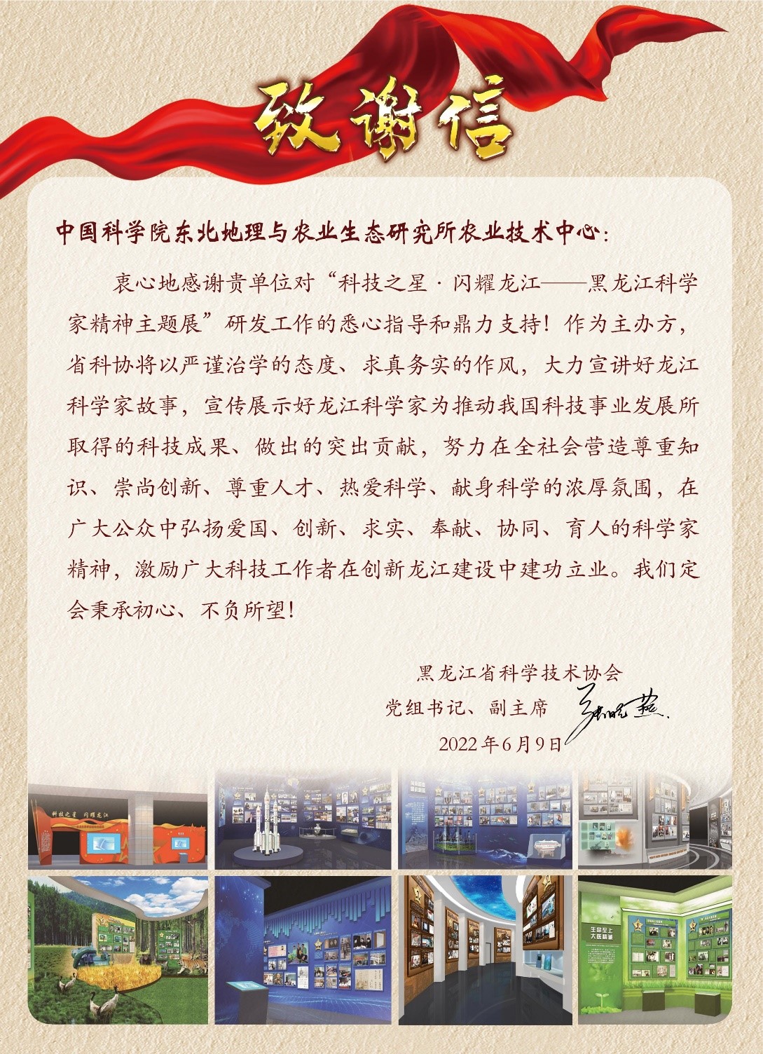 日前,黑龙江省科协党组书记、副主席张晓燕发来致谢信。感谢农业技术中心综合办(含党办)对“科技之星·闪耀龙江——黑龙江科学家精神主题展”大力支持。该主题展涵盖我省科学家最多、涉及领域最广,是省科协依托省科技馆历时10个月精心打造的大力弘扬科学家精神,讲好龙江科学家故事,展示龙江科技贡献的科学家精神教育基地,也是党建与科技深度融合的活动场所。农业技术中心携手刘兴土院士团队为该主题展提供了刘兴土院士相关简历和主要工作业绩。