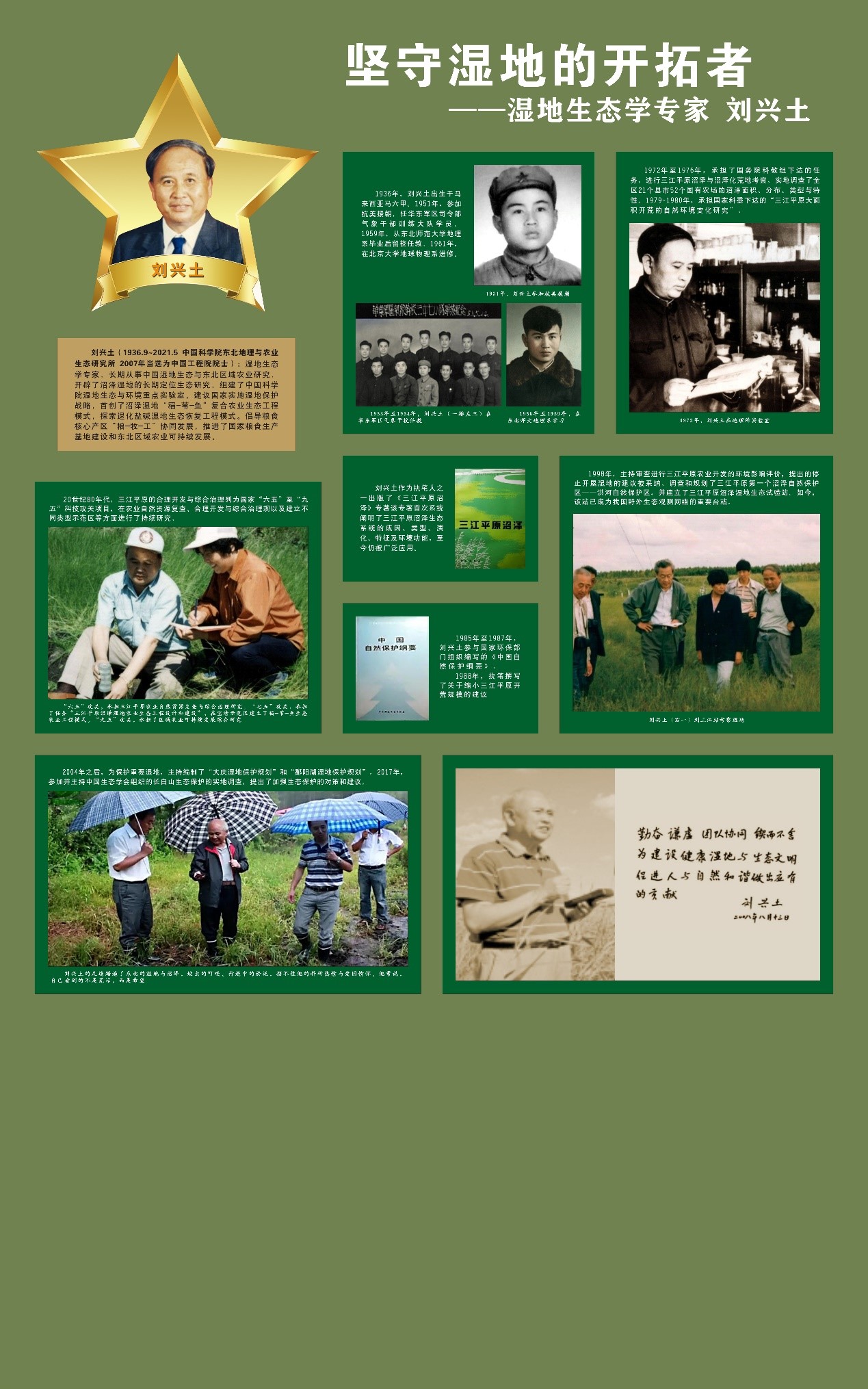 刘兴土(1936--2021),中国工程院院士,中国著名的自然地理学家、湿地学家和区域农业专家,中国地理科学成就奖获得者,曾任中国科学院东北地理与农业生态研究所所长,研究员、博士生导师。他开辟了沼泽湿地的长期定位生态研究,组建了中国科学院湿地生态与环境重点实验室,他最早建议国家实施湿地保护战略,他首创了沼泽湿地稻-苇-鱼复合农业生态工程模式,探索退化盐碱湿地生态恢复工程模式并推动了相关生态经济产业发展。他倡导粮食核心产区粮-牧-工协同发展,提出要保护东北玉米带和大豆带,适度发展三江平原水稻种植规模等具有前瞻性的战略咨询建议。他主持完成国家及相关部委重大任务50余项。他主编和参编专著24部,发表论文180余篇。他荣获国家科技进步奖二、三等奖3项,省、部级科技奖一、二等奖7项。曾被评为国家级有突出贡献的中青年专家、全国优秀归侨知识分子、国家科技攻关先进个人、首批省管优秀专家、省劳动模范,获国务院政府特殊津贴。