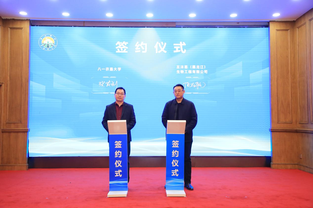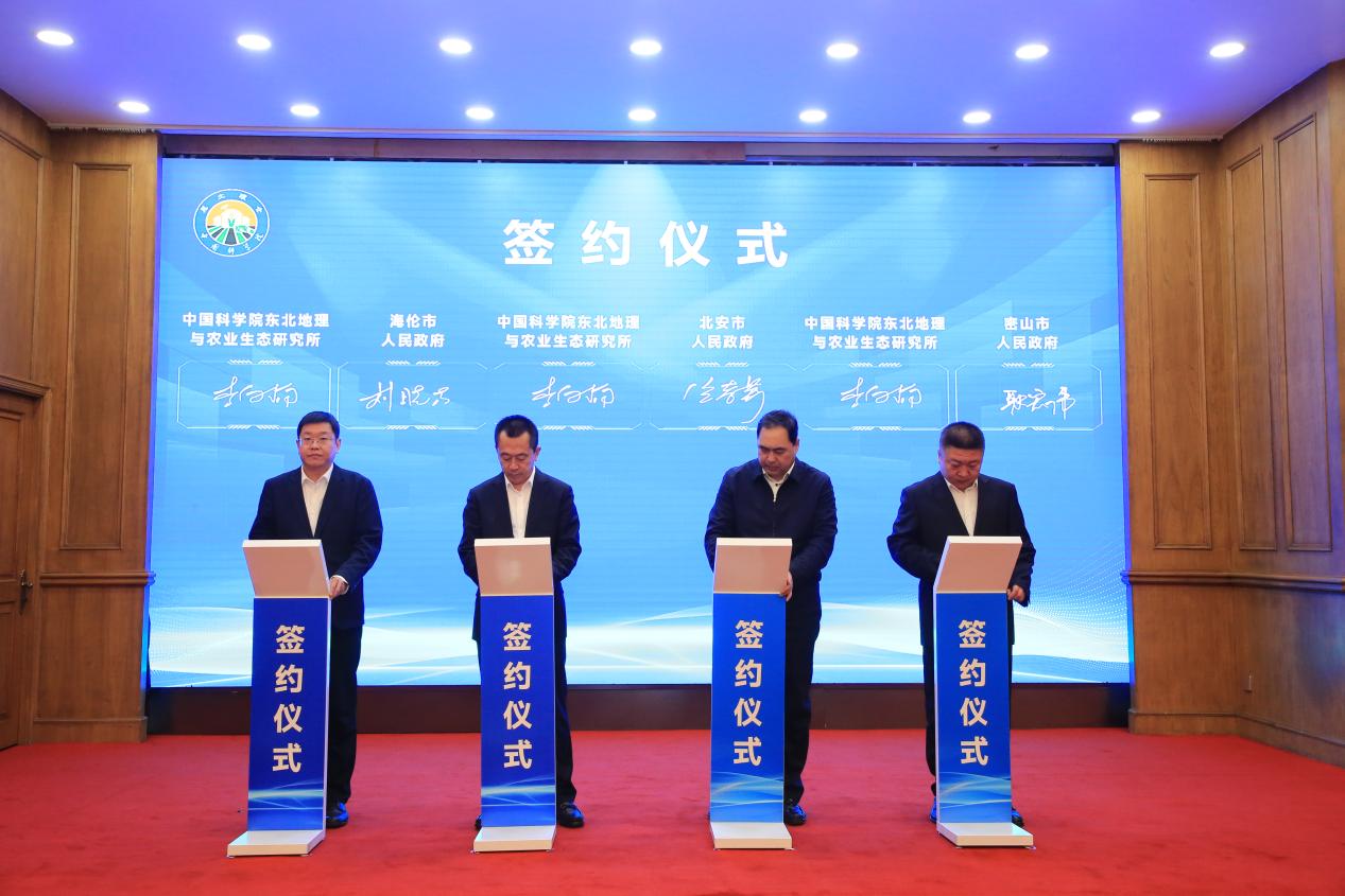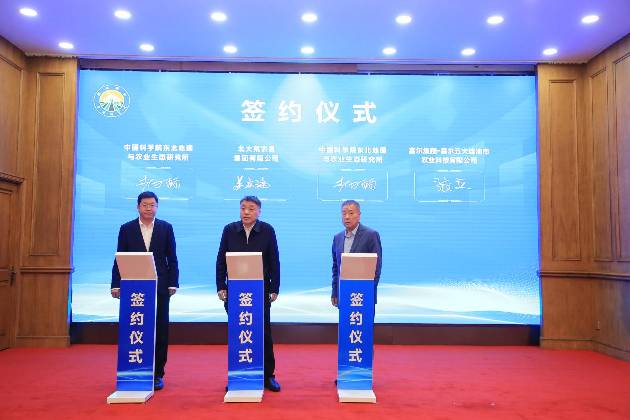 东北地理所与海伦市、北安市、密山市人民政府分别签署了科技创新合作协议,进一步深化地方科技合作。东北地理所与黑龙江省农业科学研究院、黑龙江大学、佳木斯国家农高区、北大荒农垦集团等机构达成合作协议,携手推进黑土地保护技术的研发与推广。在成果转化方面,东北地理所与富尔集团-富尔五大连池市农业科技有限公司签署大豆品种转让协议,双方以2000万元的价格将大豆新品种“东生22”的生产经营权进行转让,创下了第三积温带大豆品种转化费用最高记录。黑龙江八一农垦大学与互沐思生物工程有限公司签约。