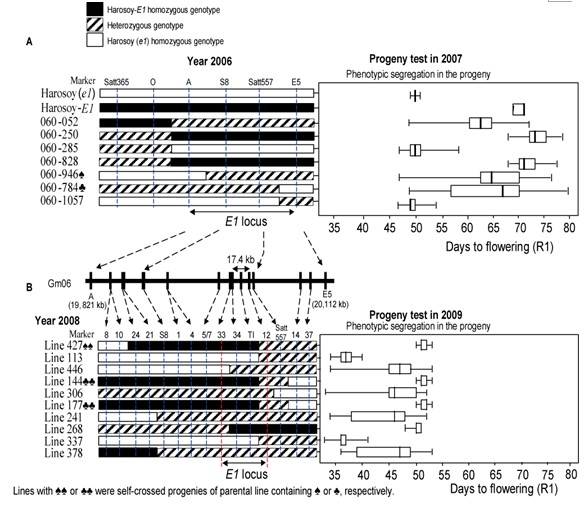 大豆是敏感型高温短日作物,适应于高纬度环境的大豆栽培种对光周期必须具有不敏感性。经典遗传学研究表明:4个主要位点E1...生育期长度是决定大豆产量的重要因素之一,并与种植纬度、种植季节密切相关,是育种主要选择目标性状,而生育期是光周期反应的重要指标。