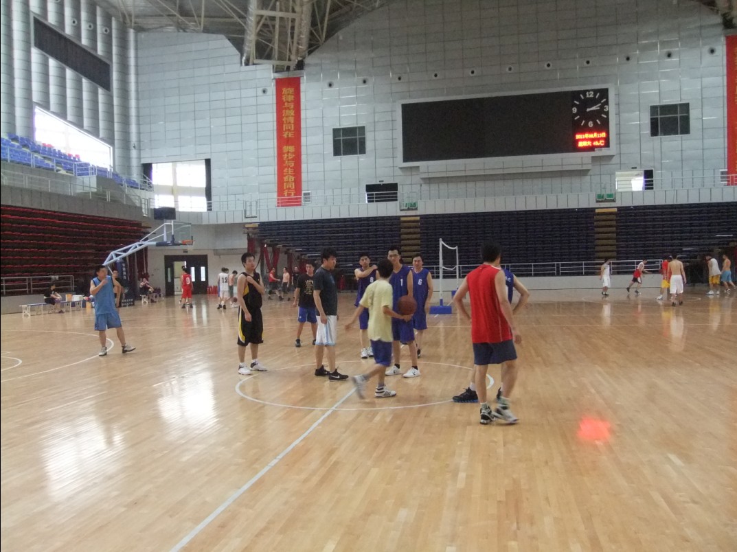 8月13日下午3时,由老师和研究生组成的哈区篮球联队和省肿瘤医院篮球队进行了一场激烈的篮球友谊赛,在刘宝辉助理的带领下,哈区联队率先进入规定场地进行了赛前热身,并且共同研究战术。