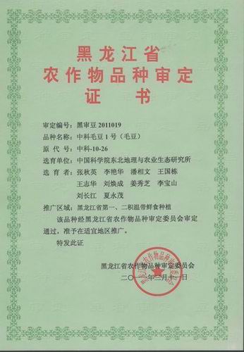 由我所张秋英研究员等经过多年技术攻关,精心选育的菜用大豆新品种“中科毛豆1号”(品种审定编号:黑审豆2011019),2011年3月11日通过了“黑龙江省农作物品种审定委员会”审定。