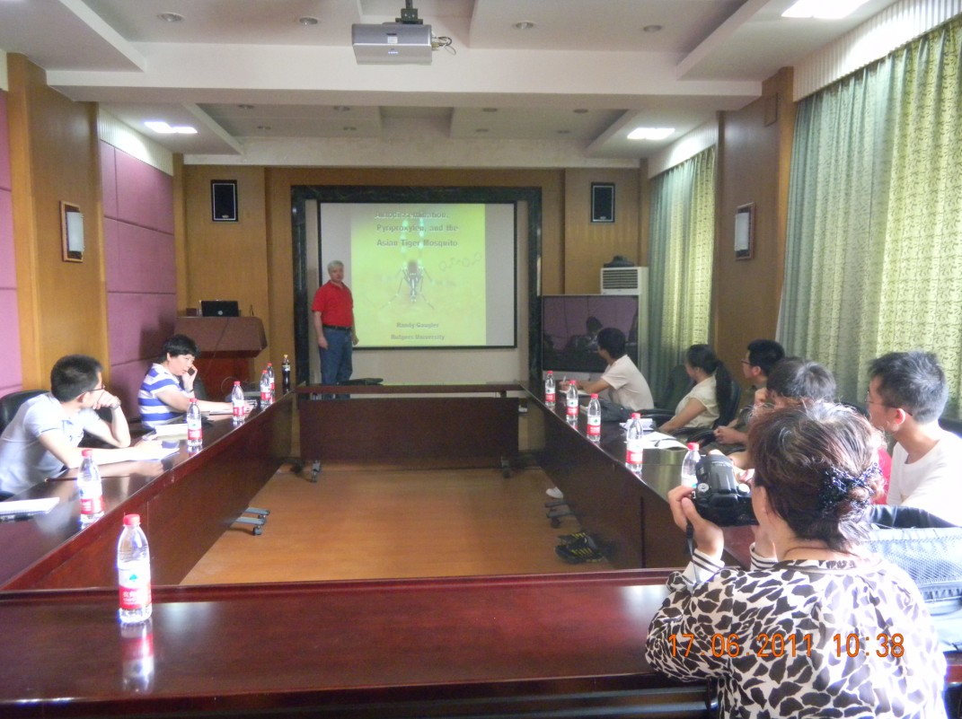 在这次学术交流活动中,Randy Gaugler教授和王义博士分别做了“Autodissemination, Pyriproxyfen andAsian Tiger Mosquito”和“Host Cues Induced Egg Hatching in Mosquito Parasitic Nematode Strelkovimermis spiculatus”的学术报告,介绍了美国害虫生物和生态控制研究的最新进展。