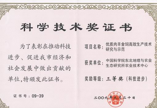 草地农牧业学科组承担的“优质肉羊舍饲高效生产技术研究与示范”为第一完成单位,获得哈尔滨市科技进步三等奖。