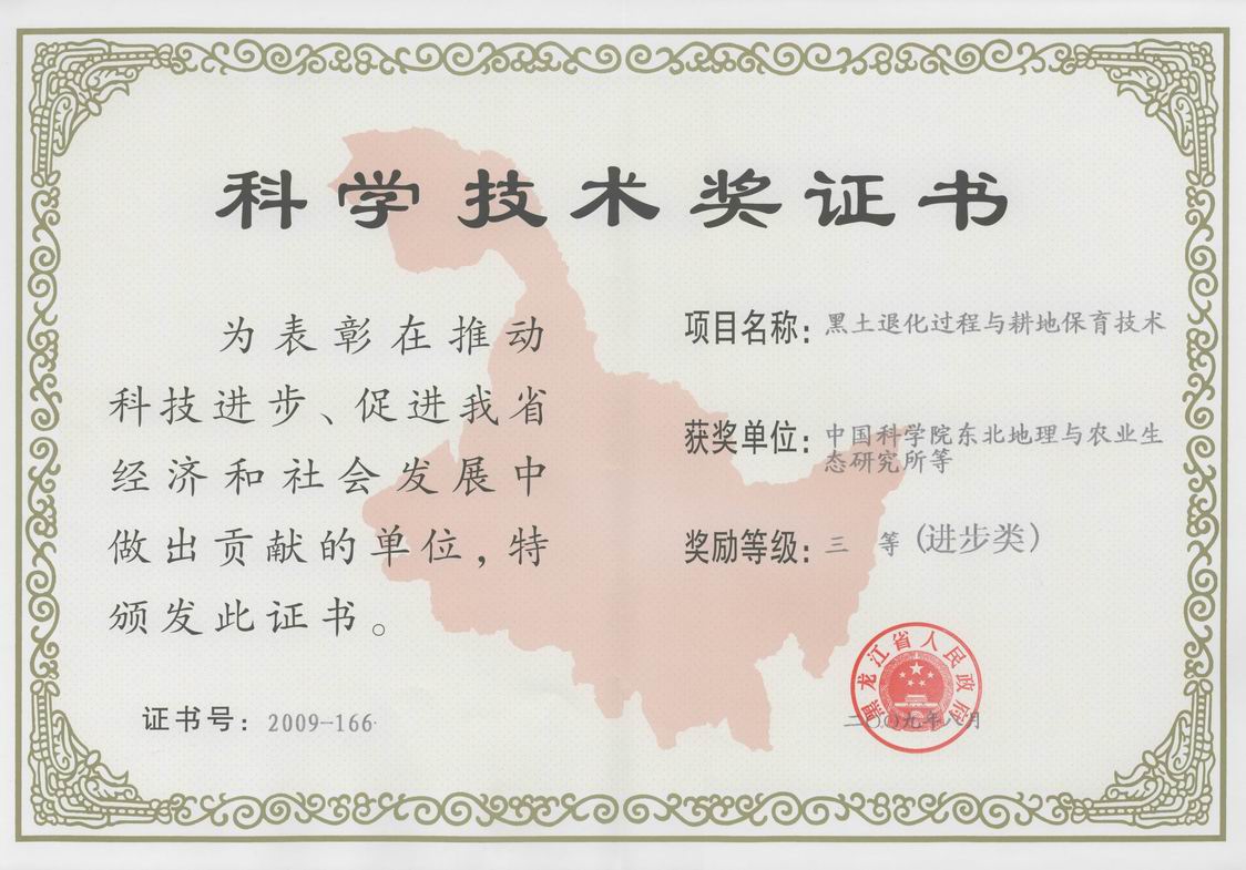 黑土退化与修复学科组承担的“黑土退化过程与耕地保育技术”2009年获得了黑龙江省科技进步三等奖。