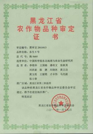 2011年1月19日,我所研制的大豆新品种“东生5号”(品种审定编号:黑审豆2011013),经“黑龙江省农作物品种审定委员会”审定通过,准予在适宜地域推广。