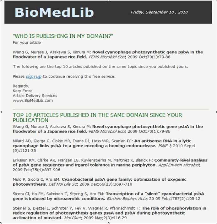 BioMedLib是生物医学科技搜索引擎。在MEDLINE数据库发表的上亿篇生物医学科技论文中,自动评测出相关领域中发表的十大最佳论文(Top 10 Articles Published in the Same Domain Since Your Publication)。我所王光华研究员于2004年发表在《应用生态学报》上论文“Antibiotics production by bacterial agents and its role in biological control”(2004, 15:1100-1104)和2009年发表在FEMS Microbiology Ecology上的论文“Novel cyanophage photosynthetic gene psbA in the floodwater of a Japanese rice field” (2009, 70:79-86)最近被评为同领域研究十大最佳论文。
