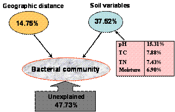 动植物在陆地生态系统中存在一定的地理分异规律。与动植物相比,对于陆地生态系统中数量巨大、种类多样的土壤微生物而言,是否存在生物地理分布格局及其驱动因素是什么?是目前土壤学和微生物生态学研究的前沿科学问题。已有的研究结果表明,不同生态系统中的土壤微生物受到生物和非生物因素的双重影响,群落结构多样性及群落结构组成存在较大差异。在这些影响因素中土壤pH被普遍认为是制约土壤细菌群落结构变化的主要因素。值得指出的是,多数研究均是基于土壤pH值差异较大的不同原始土壤进行的,而对于同一种土壤类型,土壤pH值变化较小而其它土壤理化性质差异较大时,决定土壤微生物生物地理分布的因素是什么是一个值得探讨的科学问题。