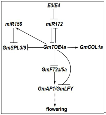 中科院大豆分子设计育种重点实验室成功克隆了 microRNA172 的靶基因 GmTOE4a,功能互补实验表明 GmTOE4a 延迟大豆开花;研究发现GmTOE4a延迟从营养生长到生殖生长期的转换是通过抑制开花相关基因 GmFT2a、GmFT5a、GmAP1、GmLFY 的表达,而促进 GmFT4 和 miR156 的表达实现的。进一步研究发现GmTOE4a 参与的光周期调控大豆开花途径是在生育期基因 E3 和 E4 的作用下,依赖于 GmCOL1a 的表达,并且在转录水平不受 GI 同源基因 E2 的调控。