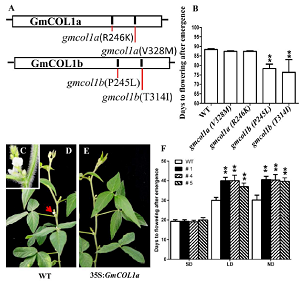 CONSTANS (CO) 在很多植物的光周期反应机制中具有重要的角色。但是,目前尚未有关于CO在大豆开花期调控途径的功能研究。为了填补这项空白,我们课题组克隆了大豆中的与拟南芥CO基因同源的两个基因—GmCOL1a和GmCOL1b,并研究长日照条件下,GmCOL1a和GmCOL1b对大豆光周期的影响。课题组的前期研究结果表明,长日照条件下,大豆开花期主要受E1、E2、E3和E4的影响。本研究进一步明确了这四个基因的调控关系,即在转录水平上,E3和E4促进E1和E2的表达,E1抑制E2的表达,并且明确这四个基因对GmCOL1a和GmCOL1b的表达起到促进作用。GmCOL1a的过表达会延迟大豆的开花期,GmCOL1b突变后,开花期提前,即在长日照条件下,GmCOL1a和GmCOL1b抑制大豆的开花期。其中,GmCOL1a通过抑制GmFT2a/5a的表达而抑制大豆的开花期。此外,我们研究还表明,GmCOL1a抑制E1和E2的表达,反之亦然。因此,我们认为,E1、E2和GmCOL1a形成负反馈调节环。综上,GmCOL1a和GmCOL1b在长日照条件下,抑制大豆的开花期,进一步完善了大豆光周期的调控网络。