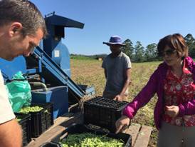 为了执行中国-南非政府间科技合作“菜用大豆抗炸荚育种”交流项目,中方项目主持人我所研究员张秋英和项目组成员夏正俊研究员、李艳华研究员及浙江省农业科学院作核所所长朱丹华研究员,于2016年1月19-24日到南非自由大学和德班菜用大豆研究发展中心进行为期6天的合作研讨交流。项目组实地考察了菜用大豆研发中心农场,就不同菜用大豆品种的表型进行了田间鉴定,同时讨论了如何利用回交的方法并结合分子生物学进行抗裂荚鉴定,加速菜用大豆抗裂荚的改良途径。在此之间,项目组成员还同世界著名的菜用大豆育种家,台292培育者。亚洲蔬菜研究和发展中心原副主任S.Shanmugasundaram教授就菜用大豆的研究发展存在的问题交流各自的经验和体会,并实地参观了毛豆生产基地,观看了菜用大豆的机械现场收割情况,朱丹华研究员就收获过程的漏荚问题提出了改进意见,建议增加毛刷解决问题。