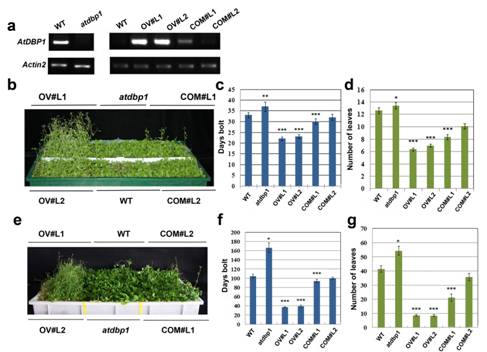 图1. AtDBP1过表达植株与敲除的突变体的开花表型调查