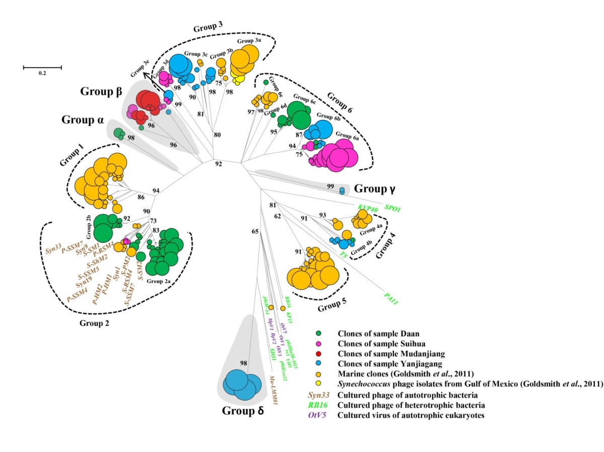 为此,东北地理所农田分子生态学科组博士研究生王新珍等人在王光华研究员指导下,采用免培养的分子生物学技术,从东北稻田水体中捕获近千条表征蓝藻病毒遗传多样性的不同分子标记基因,包括可能来源于寄主的辅助代谢光合基因psbA和磷营养调控基因phoH,以及T7型蓝藻病毒DNA合成酶基因DNA pol等。研究结果发现,稻田环境中蓝藻病毒psbA基因在系统进化树中的分布范围窄,建立了7个新的稻田蓝藻病毒psbA分布群,发现稻田环境蓝藻病毒psbA基因分布不存在地域差异。对两个辅助代谢基因研究结果建立了9个全新的稻田蓝藻病毒DNA pol基因群和4个新的蓝藻病毒phoH基因群,发现这两个分子标记基因在稻田中分布存在明显的地域差异。综合分析显示稻田环境中这三种蓝藻病毒基因分布均与湖泊环境关系近,而与海洋环境关系远。该研究结果对于揭示稻田蓝藻病毒不同分子标记基因分布特征、发现新的病毒基因资源、了解蓝藻病毒在生态系统中的分布地位等具有一定的意义。