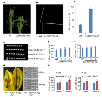 图1.OsWRKY53过表达转基因水稻呈现出叶倾角增大、种子增大的表型