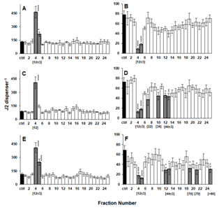 图3线虫对植物根渗出物RP-HPLC分离组分的趋化性;辣椒(AB)、大豆(CD)和万寿菊(EF)