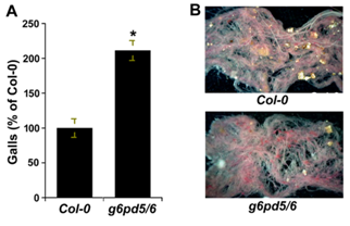 戊糖磷酸途径(Pentose phosphatepathway, PPP)是植物体中葡萄糖代谢的重要途径,可以产生大量的供还原性物质合成之用的还原剂NADPH,其中间产物亦可作为底物原料参与核酸、氨基酸、脂肪酸等的生物合成。葡萄糖-6-磷酸脱氢酶(G6PDH)是PPP途径的关键性调控酶,催化第一步不可逆的葡萄糖-6-磷酸氧化反应并严格控制着PPP途径的代谢速率。已有的研究表明,在植物寄生线虫的取食点细胞中发现葡萄糖-6-磷酸、果糖-6-磷酸、甘油酸-3-磷酸等中间物含量显著上升,恰恰这些物质是糖酵解途径和PPP途径共有的中间代谢物,暗示了PPP途径可能在植物寄生线虫与寄主互作中具重要作用。为了验证这一假设,农田有害生物控制课题组利用模式植物拟南芥突变体、结合生理生化及细胞生物学等手段深入研究PPP途径的关键酶G6PDH在根结线虫与寄主植物互作中的生物学功能及其调控机制。研究表明,根结线虫侵染导致寄主根内G6PDH酶活性显著升高(图1);Western Blotting及基因表达分析显示胞质亚型G6PDH可能主要贡献了总酶活性提高。和野生型相比,两种胞质亚型的功能缺失突变体g6pd5/6根内G6PDH酶活性显著降低,然而对根结线虫的敏感性却显著增加(图2)。进一步研究发现,线虫侵染后突变体根内的ROS水平、基础防御相关基因PRs及WRKYs的表达量明显低于野生型。该研究证实了依赖G6PDH的PPP途径通过激活ROS信号参与调节了植物对根结线虫的防御反应(图3),有助于我们从生理代谢水平更好地认识寄主与线虫的互作机制,为选育抗植物寄生线虫作物品种提供理论依据。