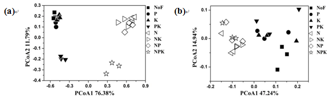 图1不同化肥处理对农田黑土细菌群落(a)和固氮菌群落(b)结构影响的PCoA分析