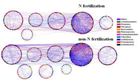 长期以来,化肥施用作为一种主要的农业措施在提高农作物产量上具有显著成效,但诸多研究表明长期的化肥施加可导致土壤有机质下降、土壤氮流失加重、土壤大面积酸化以及农产品中重金属超标等问题,同时也会改变土壤微生物群落结构。然而,对于不同种类化肥的施加对微生物群落结构的影响有何异同,尚缺乏系统性的研究。为此,东北地理所农田分子生态学科组与黑龙江省农业科学院土壤肥料与环境资源研究所合作,以长期不施肥(NoF)、单施氮肥(N)、单施磷肥(P)、单施钾肥(K)、氮磷肥(NP)、氮钾肥(NK)、磷钾肥(PK)和氮磷钾混合肥(NPK)为研究对象,利用新一代高通量测序技术和分子生态网络分析,分别对上述不同化肥添加下农田黑土细菌和固氮菌群落结构进行解析。结果表明含有氮肥处理(N、NP、NK和NPK)和非氮肥处理(NoF、P、K、PK)的细菌群落和固氮菌群落均明显分成两大集团(图1),其中放线菌门(Actinobacteria)、变形菌门(Proteobacteria)和酸杆菌门(Acidobacteria)是主要的优势细菌门,慢生根瘤菌属(Bradyrhizobium)和斯科曼氏球菌属(Skermanella)是主要优势固氮菌属;含氮肥和非氮肥处理的细菌和固氮菌分子网络结构也存在明显差异(图2)。网络属性分析发现,含氮肥的细菌网络和非氮肥的固氮菌网络虽然结构简单但更稳定。土壤pH、全氮和速效钾是调控细菌网络的主要因子;土壤pH、全碳、全氮和硝态氮是影响固氮菌网络的主要因子。上述结果综合表明,在长期施加不同化肥组合处理中,含氮化肥的施加是驱动东北农田黑土细菌和固氮菌群落结构分异的主导因素。