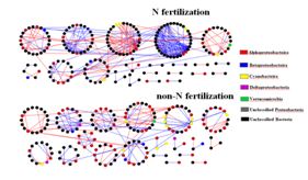 每个节点代表1个OTU,也就是相应的细菌/固氮菌物种;不同颜色的节点表示不同优势细菌/固氮菌类群;