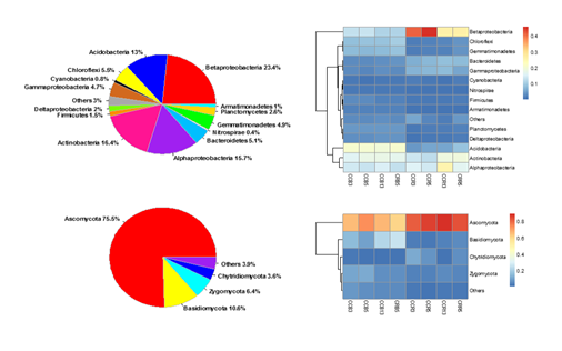 图1不同处理下细菌与真菌群落组成及聚类分析图谱