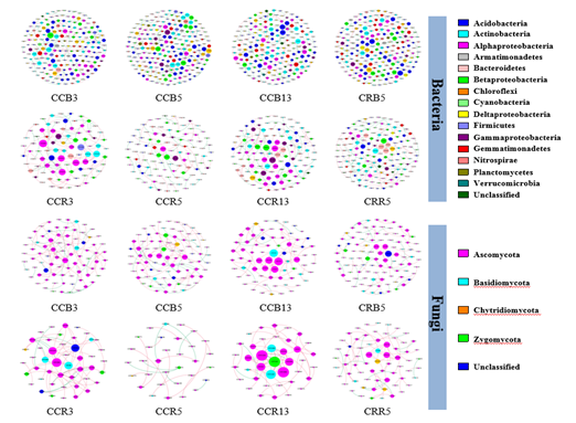 东北地理所农田分子生态学科组基于大豆短期连作(3年和5年)、长期连作(13年)及大豆-玉米轮作等处理,采用高通量测序技术系统研究了东北区大豆连作障碍发生的微生物机制。研究发现,与短期连作相比,长期连作和轮作处理显著增加了土壤养分含量、细菌和真菌多样性指数而降低了土壤真菌与细菌数量的比值。发现土壤pH和C:N分别是驱动大豆连作下土壤细菌和真菌群落发生演替的主要影响因素。长期连作和轮作处理显著增加了有益细菌Bradyrhizobiumsp和Gemmatimonassp的相对丰度,而显著降低了病原真菌Fusariumsp的相对丰度(图1)。此外,与短期连作相比,长期连作和轮作处理增强了细菌和真菌群落的网络结构与稳定性。轮作处理中具有分解木质素和纤维素等有益细菌Bryobacter、Gemmatimonas和Terracidiphilus与真菌群落中具有抑制病原微生物生长的Trichoderma、Mortierella和Exophiala作为主要的关键微生物类群(Module hubs和Connectors),可能对改善土壤环境具有积极的作用(图2)。总体而言,大豆长期连作处理在微生物数量、多样性指数及群落结构组成与短期连作处理差异显著,但与轮作处理相似,说明大豆长期连作导致了土壤产生"抑病土"的微生物基础。