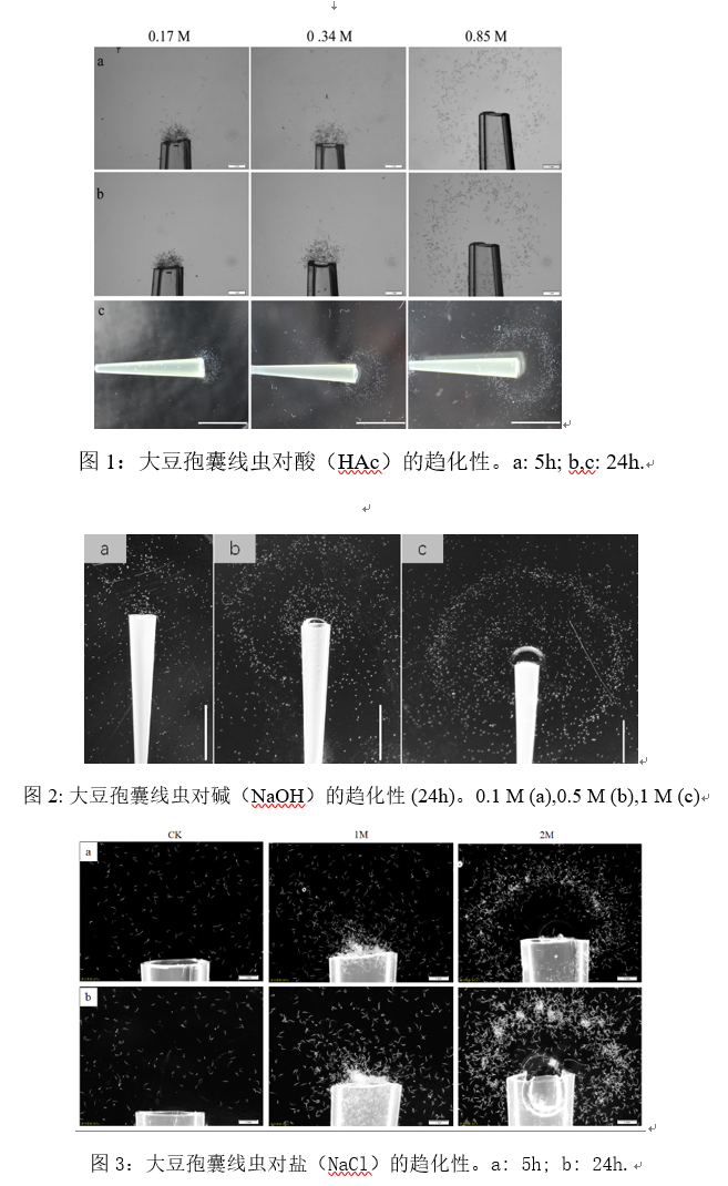 农田有害生物控制学科组王从丽研究员带领的团队利用模拟土壤三维透明的Pluronic胶系统开展了农业经济上损失非常严重的大豆孢囊线虫(SCN)和根结线虫(RKN,包括南方根结线虫和北方根结线虫)对酸、碱和盐的趋化性的行为学反应和致死性的研究,并利用微电极检测了线虫最佳趋化pH和盐离子浓度。结果表明三种线虫对酸碱盐的反应有很大差异。大豆孢囊线虫对酸(图1)、碱(图2)和盐(图3)都有趋化性,而且对不同盐离子趋化行为不一样。该研究:A. 首次发现SCN对盐具有积聚行为,并发现对Na2SO4、KCl和MgSO4均具有剂量效应导致的诱杀功能,这对线虫的防治具有重要的指导意义。B. 首次检测了大豆孢囊线虫对酸趋性最佳pH范围是4.98-5.46,对碱的最佳趋性范围有两个:8.40-8.78和9.52-9.99,最适氯离子浓度是171-256 mM。C. 低浓度的根结线虫对碱和盐的趋化性不明显,但两种根结线虫在高浓度时对碱有微弱趋性,其趋性范围和SCN相似;北方根结线虫在高浓度时对盐具有趋化作用,但南方根结线虫无论高低浓度对碱均无趋化性。D. 致死率研究表明南方根结线虫对碱的致死浓度明显高于其它两种线虫,说明南方根结线虫的耐盐和耐碱性更强。对酸性的致死率研究表明SCN对酸的致死浓度明显低于根结线虫,这与其对酸狭窄的趋化范围一致,因为根结线虫对酸性pH的趋性范围是4.5-5.5。这些研究结果证明了Pluronic胶系统和微电极的结合应用能够有效地研究土壤环境因子如pH和无机盐离子对线虫积聚和行为的影响。从应用角度,可以通过调控土壤pH和盐浓度来干扰线虫对寄主的识别,从而达到防治目的。该研究成果发表在Plant and Soil上。 论文得到国家自然科学基金(31772139,31471749)和黑龙江省自然科学基金重点基金(ZD2017006)资助。华萃博士研究生和李春杰副研究员为共同第一作者。王从丽研究员为通讯作者。论文信息和链接:Hua, C., Li, C., Jiang, Y. et al. Response of soybean cyst nematode (Heteroderaglycines) and root-knot nematodes (Meloidogyne spp.) to gradients of pH and inorganic salts. Plant and Soil (2020). https://doi.org/10.1007/s11104-020-04677-z