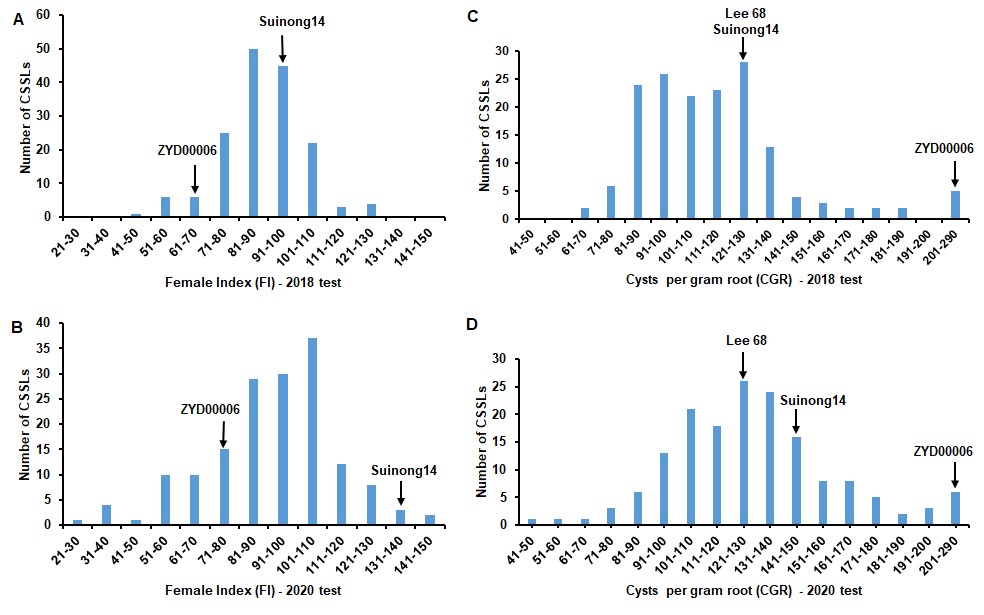 大豆孢囊线虫病是制约大豆生产的全球性病害之一。大豆孢囊线虫的抗性是由多基因和数量性状控制。大多数研究是基于高抗和高感品种杂交形成的遗传分离群体,存在高抗基因时,微效基因时常被掩盖而不能被有效检测到,然而后代对线虫的表型反应相对于亲本显现为广泛的变异。此外,当前对大豆孢囊线虫的抗性评价是建立在每株孢囊数与已知感病品种比较所得的雌虫指数,然而在研究中发现由于根重大小不一样,特别是野生品种,仅局限于每株孢囊数的抗性评价对于育种有一定的局限性。农田有害生物控制学科组王从丽研究员团队和东北农业大学陈庆山教授团队合作首次利用大豆染色体代换系(CSSLs)群体展开了对大豆孢囊线虫超亲遗传抗性的研究。