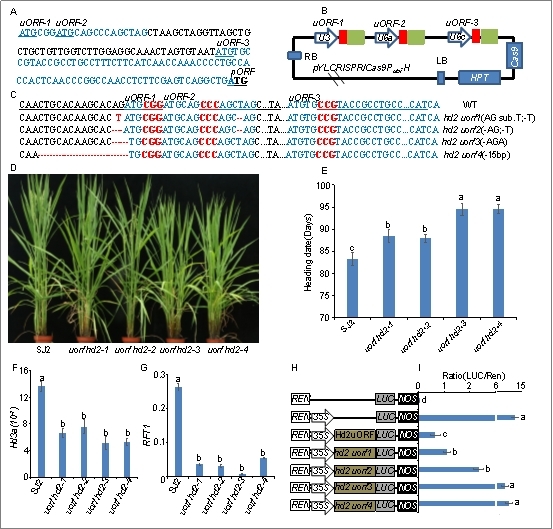 为了利用基因编辑手段提高靶基因的表达量,该团队拟对基因的上游开放阅读框架(open reading frames, uORFs)进行编辑。研究表明,uORFs可以抑制开放阅读框架(primary ORFs, pORFs)的翻译,通过编辑和突变这些uORFs可以达到提高pORFs的蛋白水平的目的。本实验室前期研究发现Hd2是控制东北水稻开花最重要的抑制子之一,序列分析发现Hd2在5'UTR区域存在3个uORF,因此,该研究团队针对3个uORF分别设计3个靶位点进行基因编辑,获得了多种不同编辑类型,抽穗期统计结果显示,突变体出现不同程度晚花(4.6天-11.2天),其中第一个uORF突变的晚花效果最明显。突变体中,抽穗期基因Ehd1、Hd3a和RFT1的表达量都低于野生型,与其晚花表型一致。进一步将Hd2 uORF与4种突变类型uorf插入到35S启动子与LUC报告基因之间,瞬时转化原生质体,发现Hd2 uORF的突变与否并不影响报告基因LUC的转录水平,但是Hd2 uORF的插入显著降低了LUC的荧光信号,而uorf的突变可以不同程度的恢复LUC的蛋白量,证实了Hd2 uORF的突变可以通过提高Hd2 pORF的翻译达到增强Hd2功能的效果,从而实现不同程度延迟开花的目的,这表明对于Hd2 uORF的编辑突变可以作为未来微效改变水稻开花性状的有效靶点。