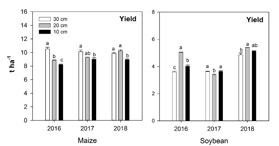 图1. 2016、2017和2018年耕层厚度对玉米和大豆成熟期产量的影响