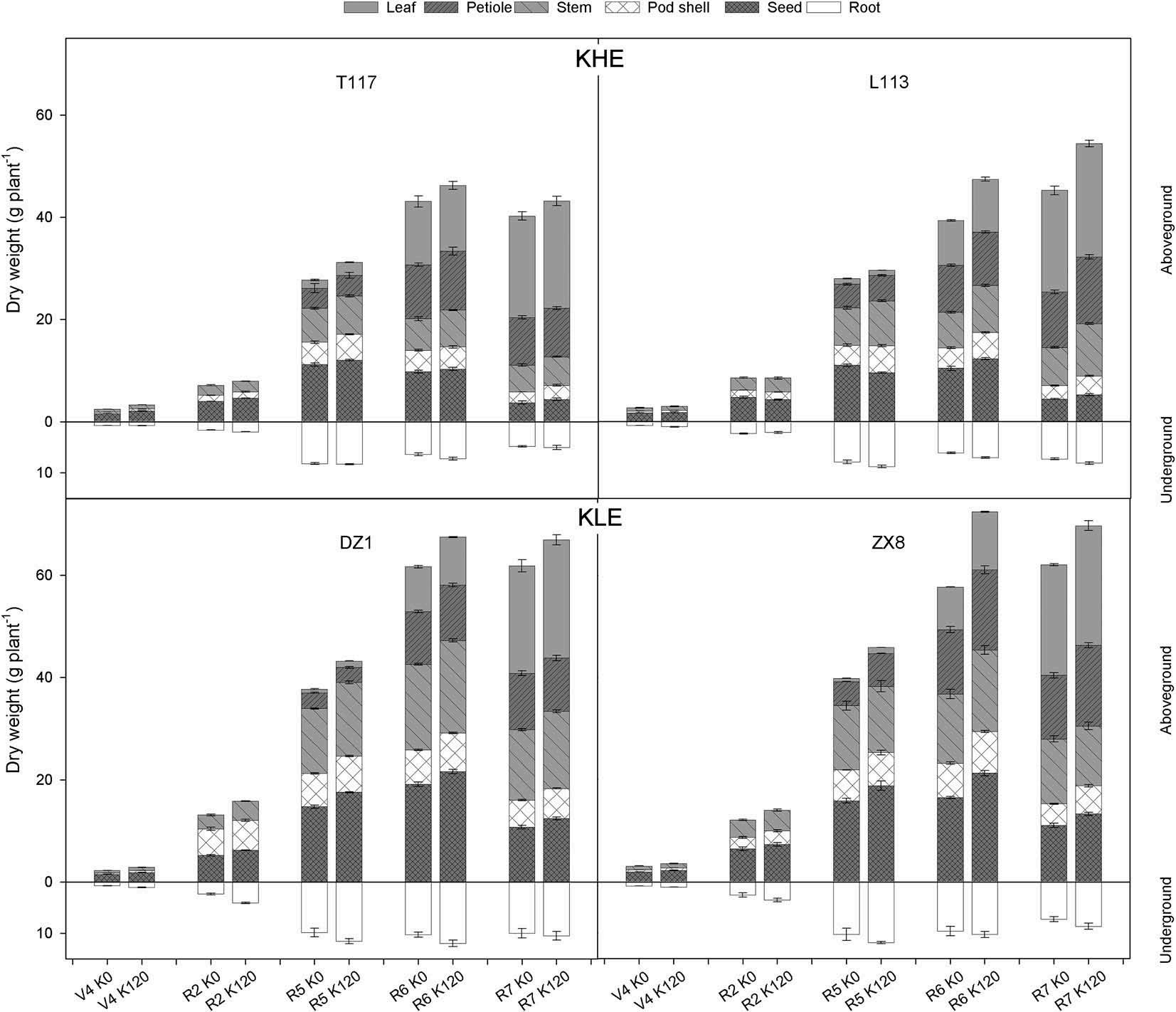 图1. 不同钾效率类型鲜食大豆不同施钾条件下干物质积累分配特征
