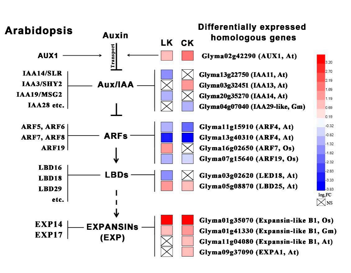 基于以上科学问题,大豆分子育种学科组张秋英研究员团队通过对40个不同鲜食大豆品种(系)进行了钾效率鉴定试验,从中筛选出了代表性的钾高效型材料进行了进一步的形态生理特征及其内在机制解析。研究发现,从钾素的利用角度,低钾条件下钾高效型品种对钾素的积累及干物质的分配调控能力更强,表现出优先供给库器官,因而具有较高的收获指数(HI)及钾收获指数(KHI)(图1)。同时,低钾对钾高效型品种的光合参数、叶面积影响较小,对比叶重影响较大,促进叶绿素a/叶绿素b比值显著增加。因此,低钾环境下的强适应性及调节能力是影响鲜食大豆钾素利用效率的关键;钾素的吸收效率方面,钾高效型鲜食大豆应对低钾环境其根系的形态调节能力更强,通过增加总根长及侧根数来增加根系与土壤的接触面积,如钾高效型材料侧根数相比对照材料可高出30%,进而增强了植株钾素的获取能力。同时,钾高效型材料的单位根长吸钾量更高(图2),在低钾环境下根系活力、伤流量与钾流量显著增加,进一步保证了钾素、水分及营养物的供应。转录组分析结果显示,钾高效型鲜食大豆根系在低钾条件下受生长素信号调控的侧根发育通路存在正向调控(图3),同时与钾素吸收利用密切相关的钾离子通道基因AKT1及钾转运体基因HAK5基因的同源基因在钾高效型材料根系中高量表达,这可能是影响根系形态调节及钾离子吸收动力增加的重要内因(图4)。以上研究结果将为钾高效型作物品种选育提供理论依据,进而也为实现黑土保育、资源高效持续利用提供重要支撑。