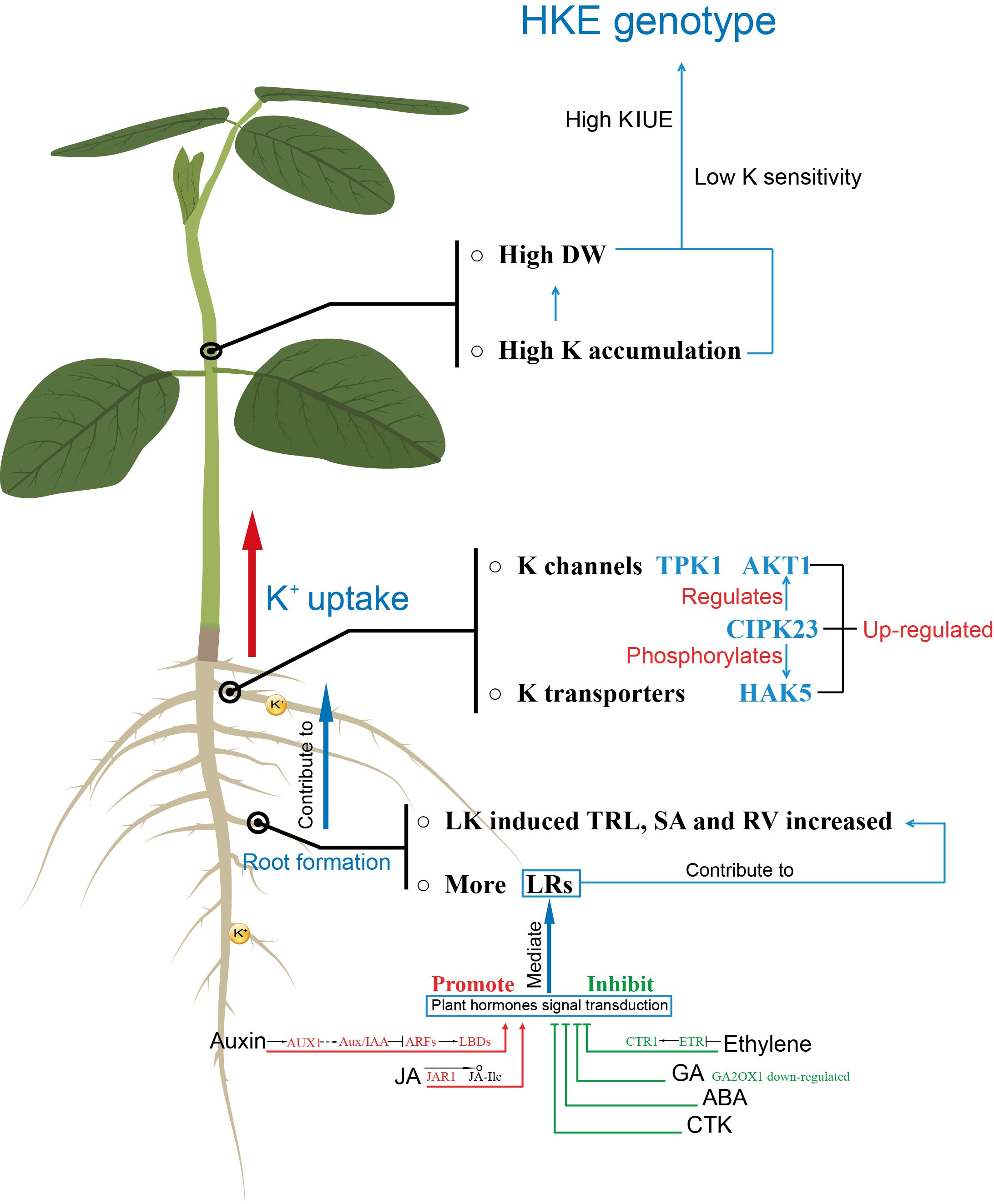 图4. 低钾条件下生长素信号调控鲜食大豆侧根发育模型