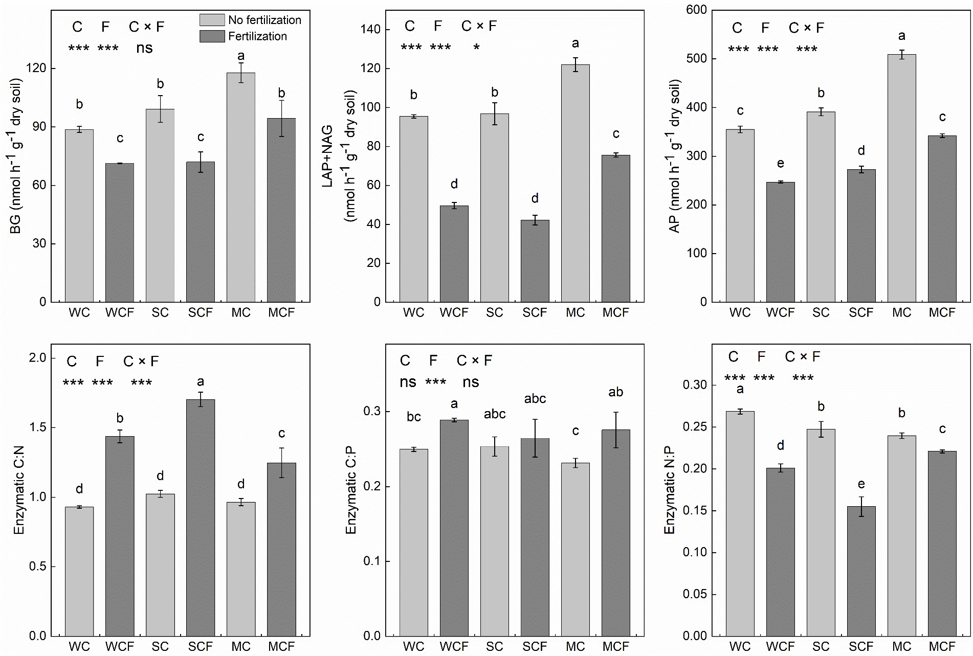 图3. 施肥和根茬输入碳氮比对土壤微生物量、酶化学计量比和养分循环的影响