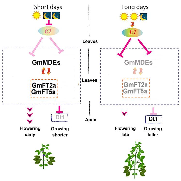 图1. E1-GmMDEs-GmFT2a/5a-Dt1响应光周期的分子模式图