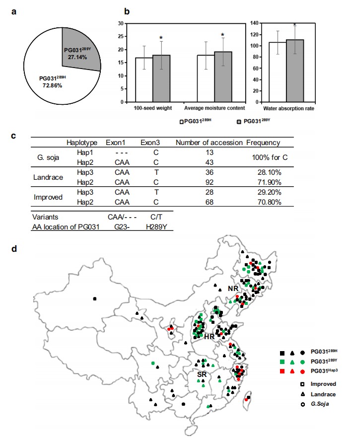 本研究发现了控制大豆种皮吸水性的一个编码多聚半乳糖醛酸酶基因PG031,该基因位于qHS2置信区间内。PG031在花中高表达,但在吸水后的种子种皮中特异表达,种子萌发后降低或无表达,表明PG031在种皮吸水性的重要作用。我们在大豆群体中鉴定到3种PG031变异,即PG031289H、PG031289Y 和PG031Hap3。其中野生大豆中仅含有PG031289H型,控制种皮不吸水性,将PG031289H导入到高渗透性大豆PG031289Y型大豆显著降低转基因种子的种皮吸水性(图1),且使百粒重有所降低,显微镜分析证实PG031289H的导入减少了种皮的栅栏层和薄壁细胞层的细胞内空间,增加了水分进入种皮的屏障。另外两个等位变异中,PG031289Y型来源于PG031289H的1个SNP突变,与种子种皮透水性增加紧密相关(图2),因为PG031289Y等位变异与大粒重相关,这个等位变异可能正在经历人工选择。该研究结果为深入了解大豆种皮吸水性的遗传机制提供了理论依据,也为定向改良栽培品种以满足不同的贮藏需求提供一定的理论基础。