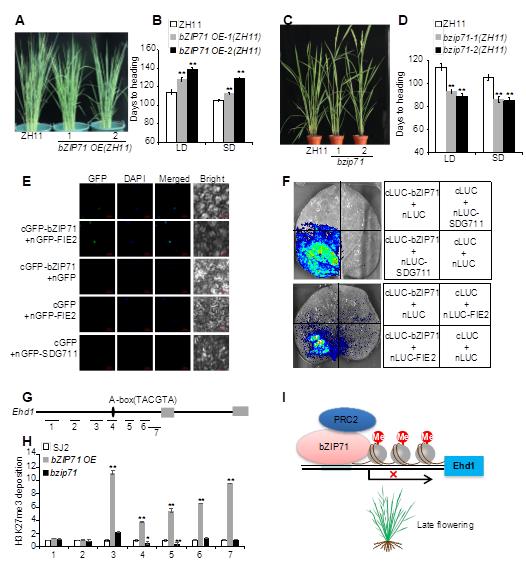 该项研究揭示了bZIP71调控水稻抽穗期的新机制,其功能发挥不依赖于Hd2、Hd4和Hd5,而是通过与多梳抑制复合体2(PRC2)的两个成员SDG711和FIE2的互作,调控Ehd1的H3K27me3水平。