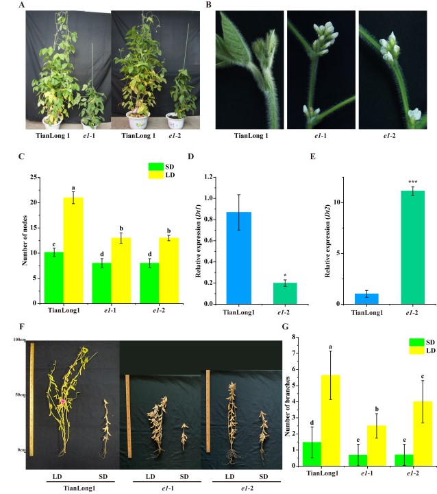近日,中国科学院东北地理与农业生态研究所大豆分子设计育种学科组在Frontiers in Plant Science在线发表了题为CRISPR/Cas9-mediated targeted mutation of the E1 decreases photoperiod sensitivity, alters stem growth habits, and decreases branch number in soybean的研究论文。该研究利用基因编辑技术,将国审大豆品种天隆1号中的E1基因进行敲除,获得了无外源基因插入的e1突变体。e1突变体的光周期敏感性显著降低,但仍然对光周期敏感,将E1敲除后并没有完全关闭大豆的光周期反应。进一步研究发现,突变体中E1的同源基因E1-La 与 E1-Lb的表达量显著上调表达,这说明E1及其同源基因E1-La 与 E1-Lb间存在遗传补偿效应。