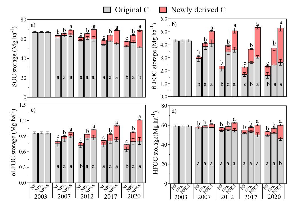 图1. 2003-2020年间不同施肥方式下土壤及其组分中新、老碳的储量变化