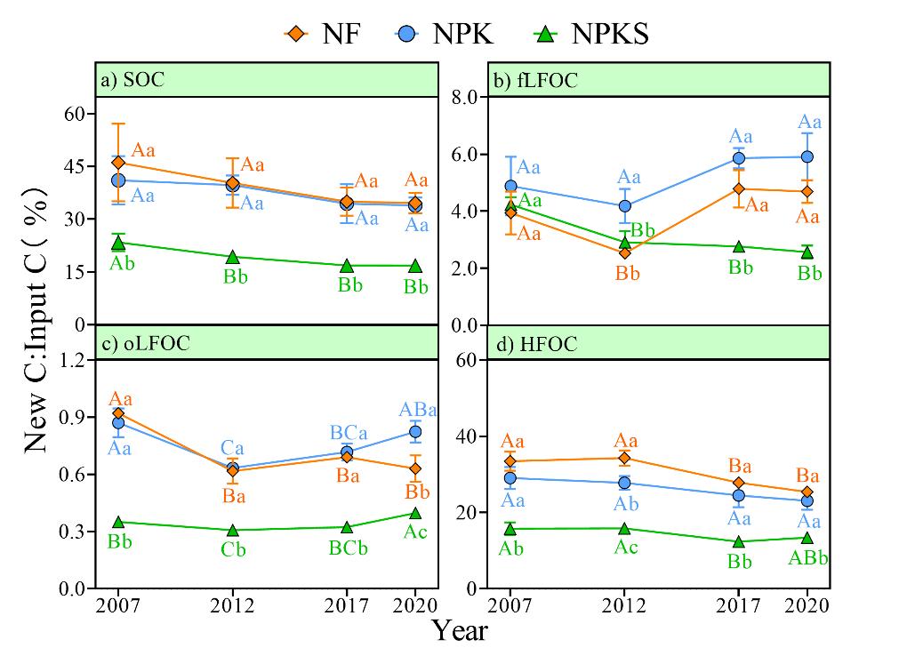 东北地理所研究人员基于中国科学院海伦农业生态实验站17年长期定位试验,选取玉米连作下的土壤,利用13C稳定性同位素技术,结合SOC物理分组方法,研究了连续秸秆还田条件下,游离态轻组、闭蓄态轻组和重组3种不同SOC组分中新、老碳的动态周转规律。研究发现,在无肥和单施化肥处理下,外源碳输入量少,老碳的损失均大于新碳的形成,即入不敷出,最终导致SOC含量呈现下降趋势,而秸秆还田处理下,新碳形成速率高于老碳分解速率,导致SOC含量持续提升(图1)。与无肥和单施化肥相比,秸秆还田配施化肥处理显著提升了秸秆源新碳的比例,但秸秆还田处理外源碳的转化率最低(图2)。稳定程度不同的SOC组分对秸秆还田的响应存在着明显差异,游离态轻组和闭蓄态轻组2种活性组分中老碳的分解速率在秸秆还田后得到缓解,而稳定性组分重组中的老碳则会在秸秆还田后加速分解,“激发效应”较强。秸秆还田促进了稳定性组分中老碳的分解,但有利于活性组分中老碳的保存。由于重组碳占SOC比例较高(86%以上),因此,从SOC整体来看,秸秆还田促进了老碳的分解,但这掩盖了不同SOC组分对外源碳输入响应的差异。总之,该研究从田间原位的角度验证了秸秆还田诱发的“激发效应”在不同SOC组分中具有强弱之分,并从侧面论证了对土壤有机质进行分组研究的重要性。