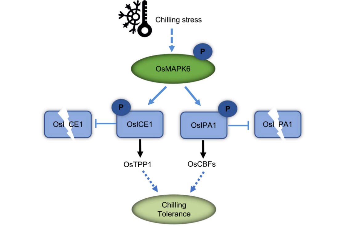 近日,中国科学院东北地理与农业生态研究所卜庆云研究团队在水稻苗期冷胁迫调控基因鉴定及分子机制解析方面取得新的进展。研究团队发现MAPK级联信号成员OsMAPK6是苗期冷胁迫的一个新的正调控因子,OsMAPK6组成型激活形式的过表达转基因植株(CAMAPK6-OE)苗期耐冷性显著提高,表现为低温胁迫下幼苗存活率升高、离子渗透率下降、苔盼蓝染色程度降低、冷胁迫响应基因OsTPP1和OsCBFs的表达水平显著升高;而osmapk6突变体(dsg1)与之完全相反。这说明OsMAPK6正向调控水稻苗期耐冷性。深入分析发现,OsMAPK6能够结合并磷酸化低温胁迫正调控基因OsICE1和OsIPA1,进而增强它们的蛋白稳定性。该项研究解析了OsMAPK6正向调控水稻苗期耐冷性的分子机制,丰富了水稻苗期冷胁迫信号调控网络,为水稻分子育种提供理论参考和基因资源。