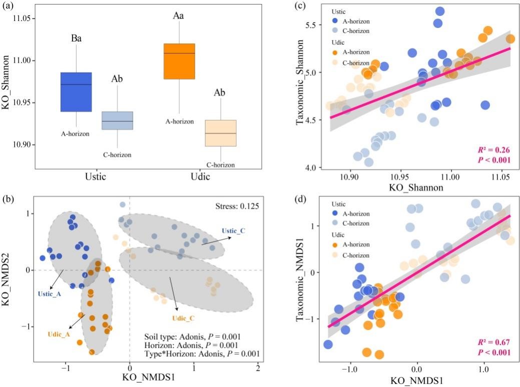 图1 干润和湿润均腐土剖面微生物功能基因多样性的变化及其与物种分类多样性的相关性
