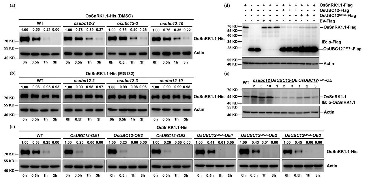 研究团队首先以染色体片段代换系(IR64背景/ Koshihikari渐渗)为试材,经萌发测试、群体构建及定位发现,与籼稻IR64相比,粳稻Koshihihikari背景中E2泛素耦合酶基因OsUBC12启动子中插入了一个转座子基因(约6kb)。进一步分析表明,OsUBC12启动子中转座子的插入能够显著提高OsUBC12的转录水平,进而促进水稻的低温萌发(图1)。OsUBC12的自然变异分析表明,该转座子的插入主要发生在粳稻亚种中,并已应用到籼粳杂交育种(图2)。分子和生化分析表明,OsUBC12能够招募OsSnRK1.1,并在体内和体外促进OsSnRK1.1的降解(图3),进而促进水稻的低温萌发。
