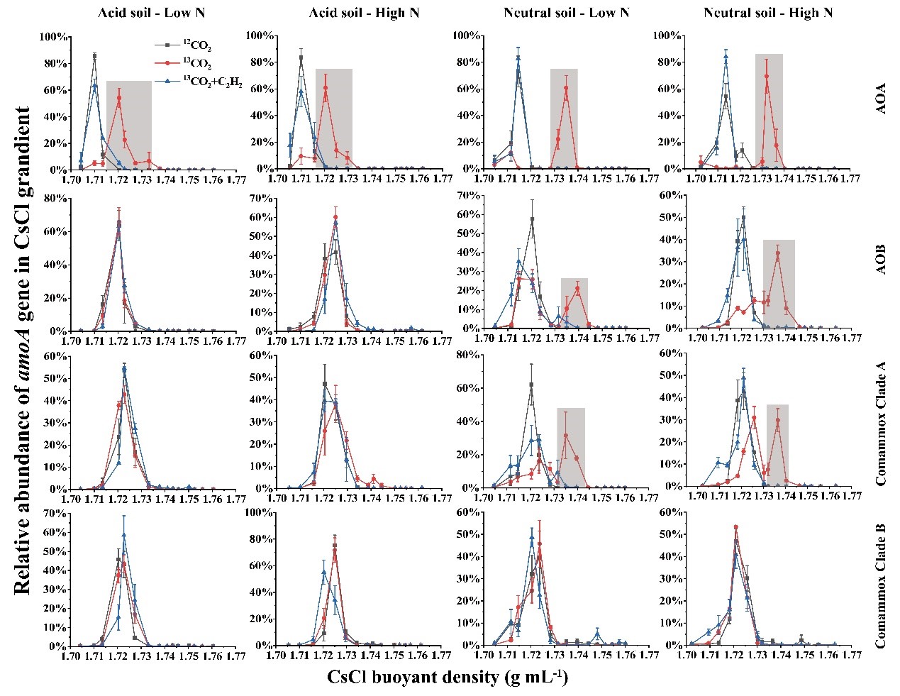 图1 微宇宙培养后,AOA、AOB、comammox Clade A和comammox Clade B amoA基因拷贝数在浮力密度梯度上的定量分布
