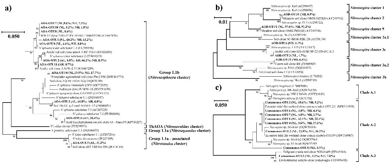 图2 基于amoA基因13C标记的重层DNA中AOA(a)、AOB(b)和comammox Clade A(c)的氨基酸序列构建的系统发育树