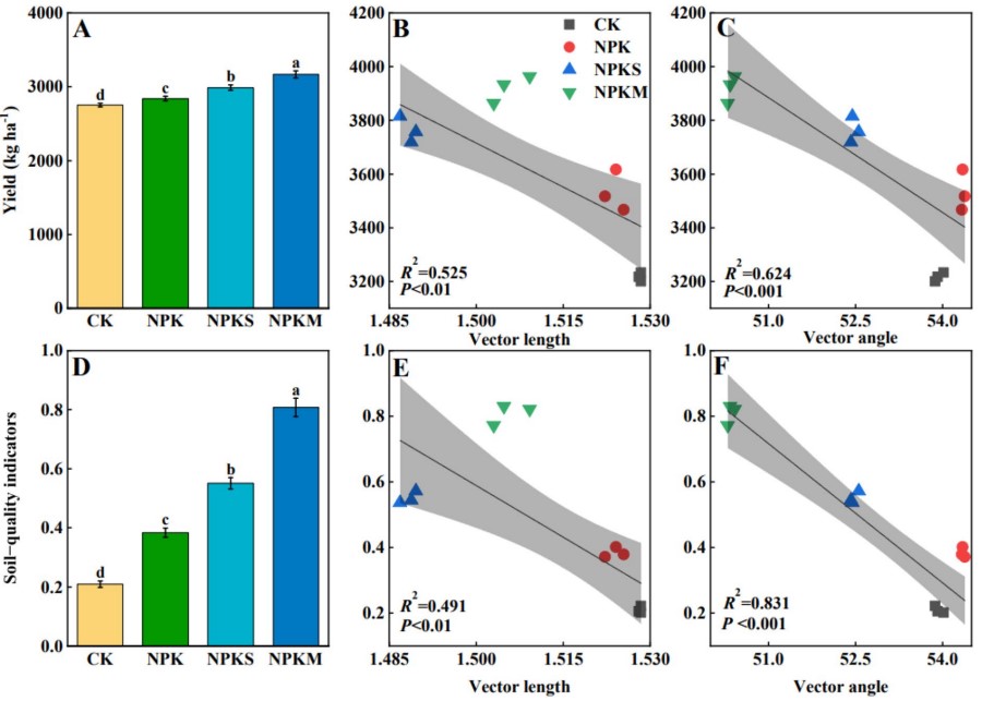 图3. 不同有机改良剂配施化肥对大豆产量(A)和土壤质量指数(D)的影响;大豆产量与向量长度(B)和角度(C)的关系、土壤质量指数与载体长度(E)和角度(F)的关系
