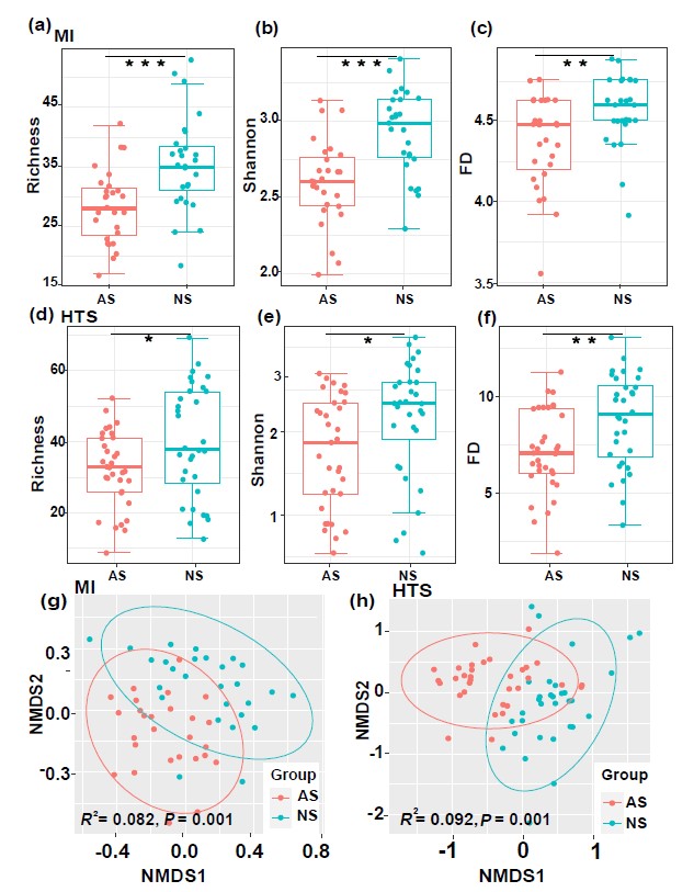 图1 农田(AS)和草地(NS)土壤中线虫的α多样性和β多样性。通过形态学鉴定方法(MI)和高通量测序方法(HTS)获得的物种丰富度(a,d)、香农多样性(b,e)、功能多样性(c,f)和非度量多维标度图(g,h)
