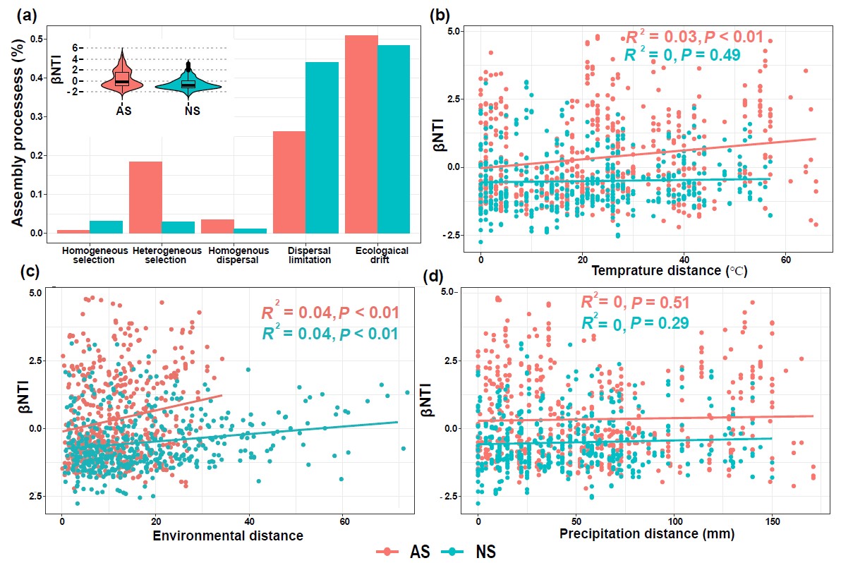 图2 农田土壤(AS)和草地土壤(NS)中线虫群落组装过程的影响因子。线虫群落组装过程对土地利用转换的响应(a)。线虫βNTI与温度距离(b)、环境距离(c)和降水距离(d)之间的关系