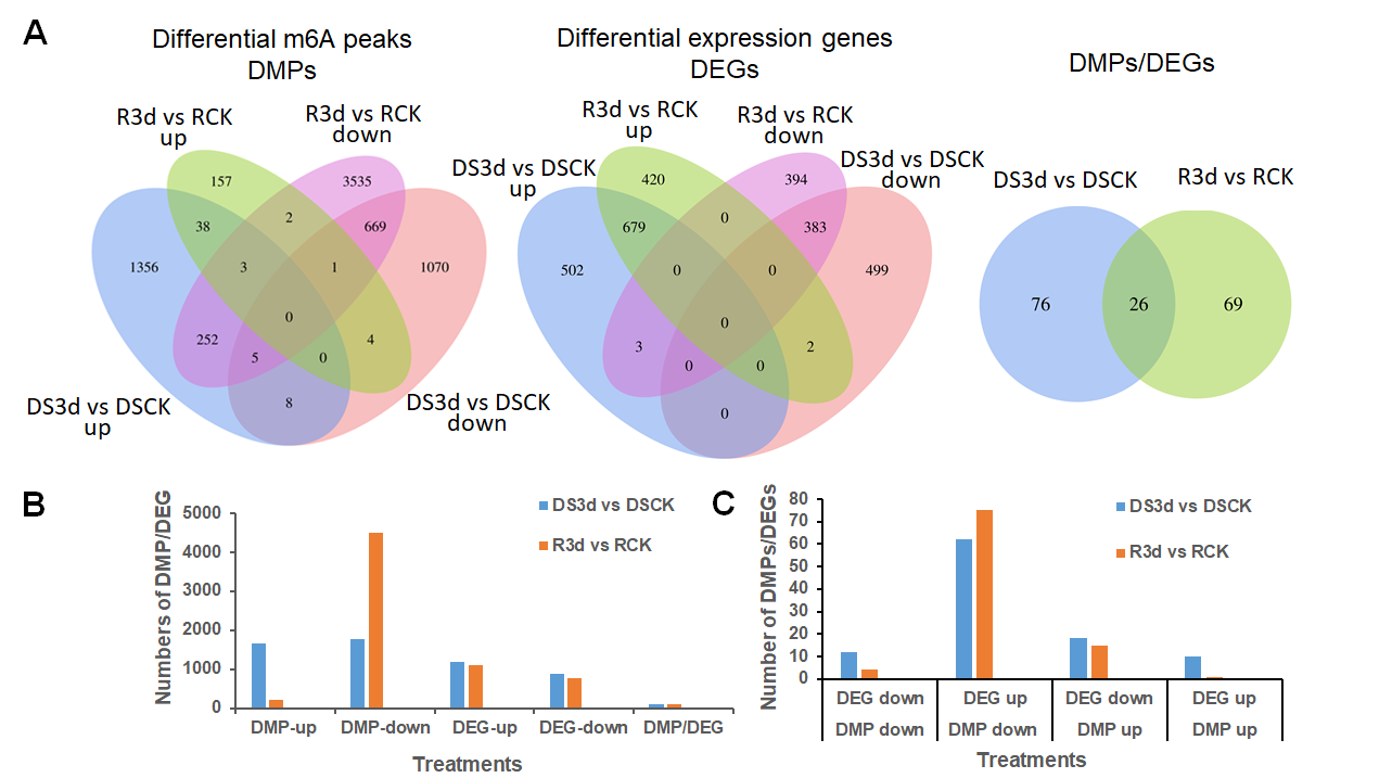 图1 抗感大豆品种在SCN侵染3d后的m6A甲基化峰(DMPs)和基因表达(DEGs)的差异